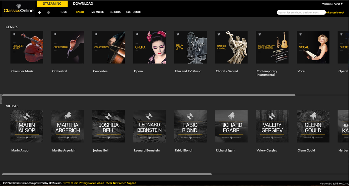 ClassicsOnline is a classical music streaming and download service with web, desktop and mobile apps. This premium service offers high-resolution downloads and high-resolution streaming with adaptive bitrate player.