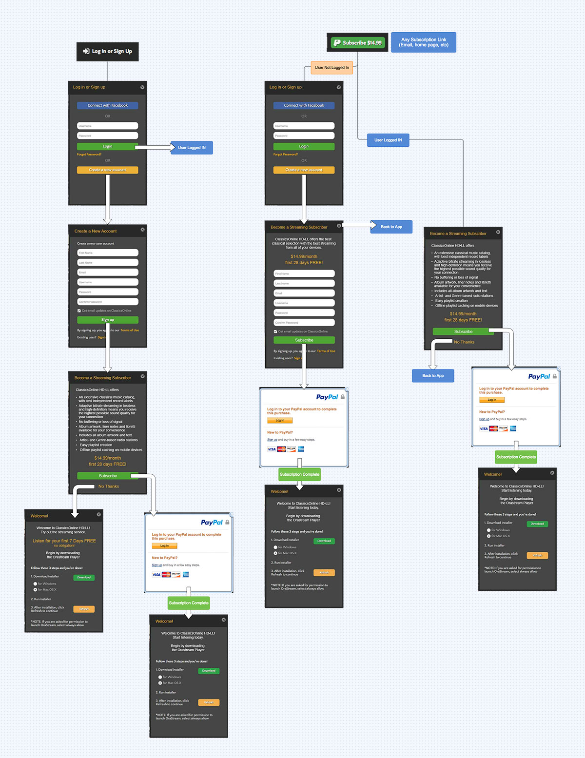 ClassicsOnline is a Streaming and Download service with web, desktop and mobile apps. User have several paths for registering and paying for the streaming subscription. This exercise defined these conversion funnels.